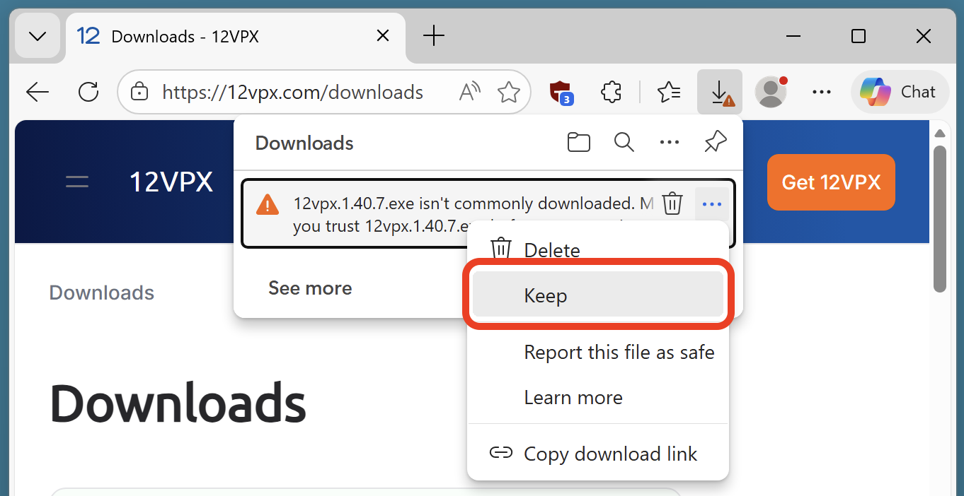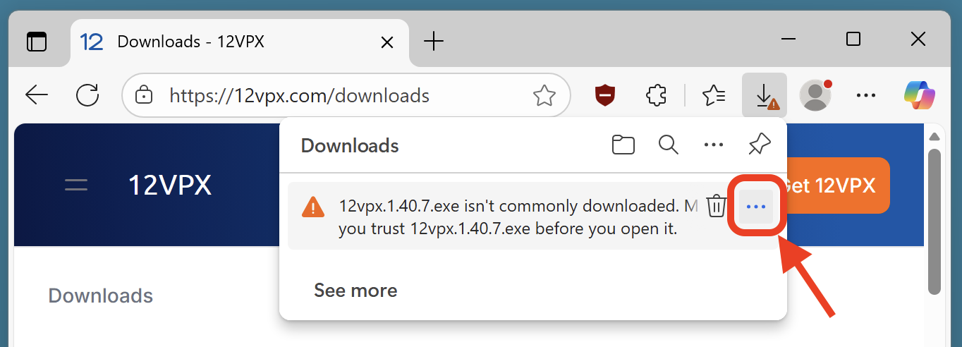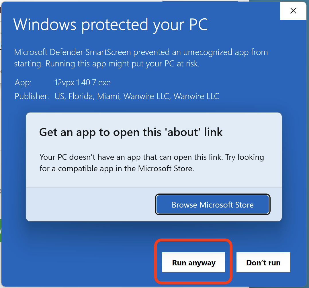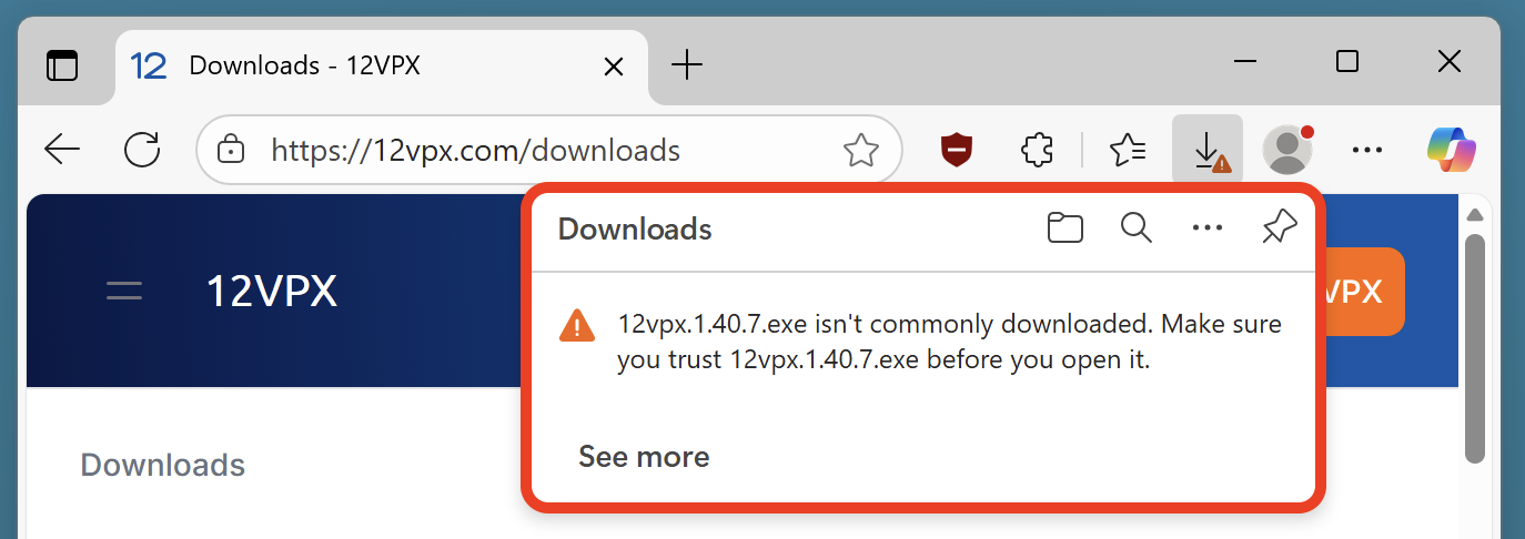 This page shows how to get passed the "12vpx.exe isn't commonly downloaded" error message.